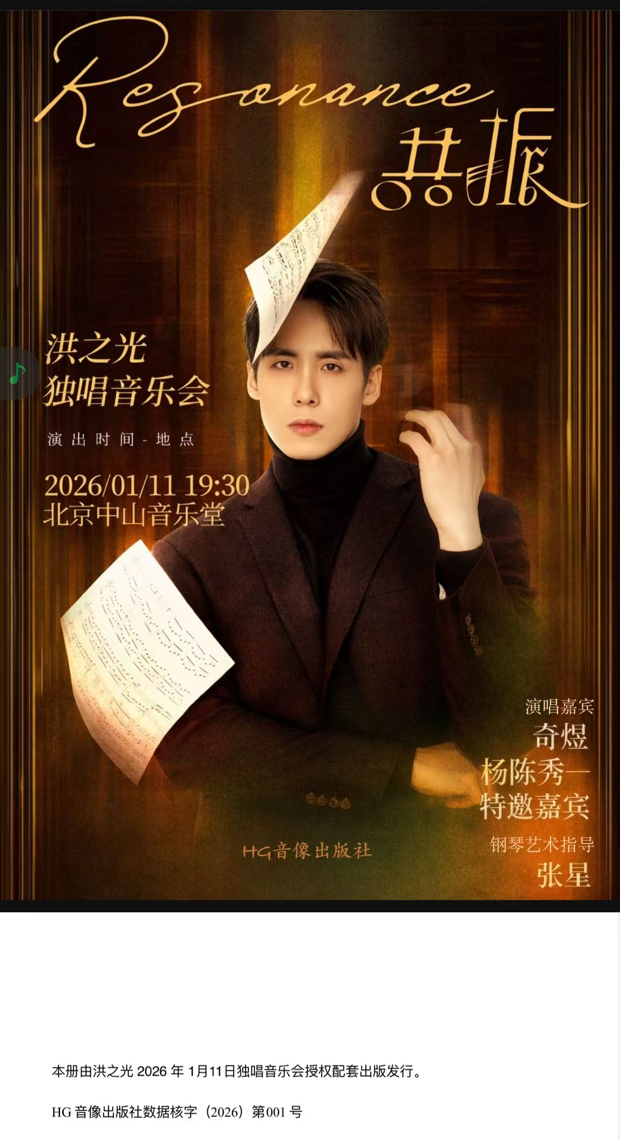 2026年1月11日,旅美青年男中音歌唱家洪之光“Resonace - 共振”个人演唱会在北京中山公园音乐堂圆满落幕。作为中国东方演艺集团首位海外引才、耶鲁大学歌剧表演博士,洪之光在业界以深厚的古典声乐功底和多元的艺术表现力著称。本次演唱会是他继国美国纽约林肯艺术中心、卡内基音乐厅,国内北京、广东、深圳等城市近十场音乐会之后,再度回馈国内观众的个人演唱会。也是以“共振”之名在北京举办第二场演唱会。